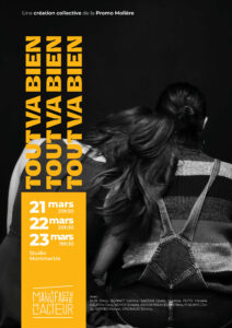 L’école innove cette année en proposant trois représentations d’un spectacle Création impliquant les élèves de la troisième année. En plus des traditionnelles pièces « cartes blanches », dont se tiendra cette année la quatrième édition, les élèves de dernière année ont aussi l’occasion d’écrire, de monter et de présenter une création. Depuis le mois de janvier, quatre heures par semaine étaient consacrées à la préparation de cette scène ouverte. Cette année, la promotion Molière a tenu à présenter une pièce avec tous les élèves. Carton plein pour les trois représentations de « Tout va bien tout va bien tout va bien».